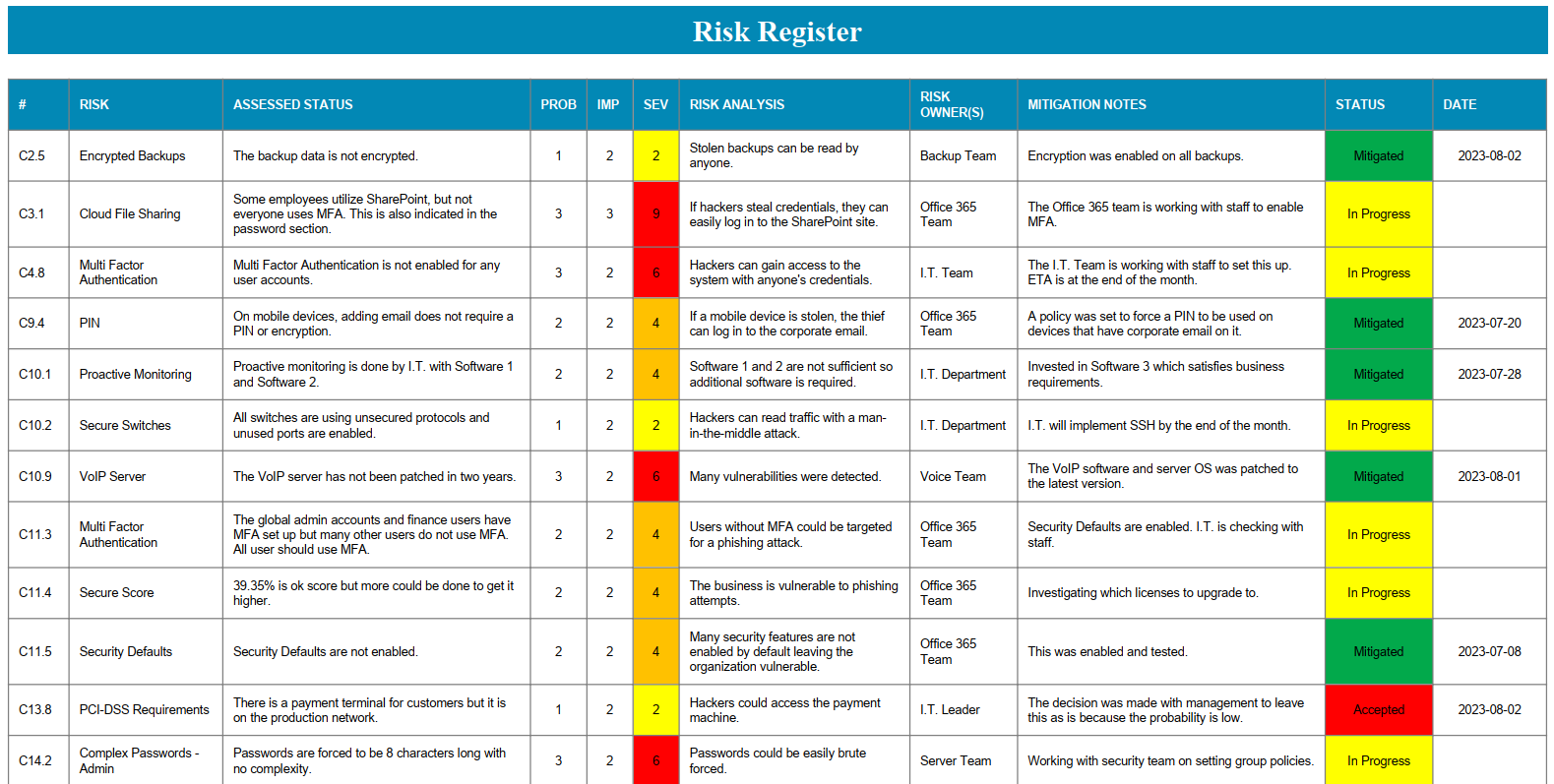 Risk registers provide a comprehensive framework for managing potential threats to an organization’s digital infrastructure. They categorize risks based on severity levels, allowing for a prioritized approach to risk mitigation. Each risk is assigned a dedicated risk owner, who assumes responsibility for overseeing its management and resolution. Mitigation notes are recorded to document strategies and actions taken to mitigate the identified risks. The risk status is continuously monitored and updated to reflect the progress of mitigation efforts, while completion dates are set to ensure timely resolution and minimize the window of vulnerability.